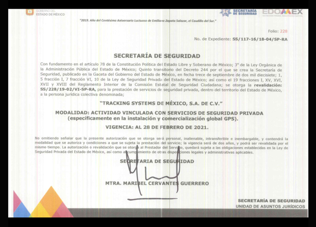 Tracking Systems de México, S.A. de C.V. Actividad Vinculada con Servicios de Seguridad Privada VII. Instalación y Comercialización de Sistemas de Posicionamiento Global (G.P.S.)